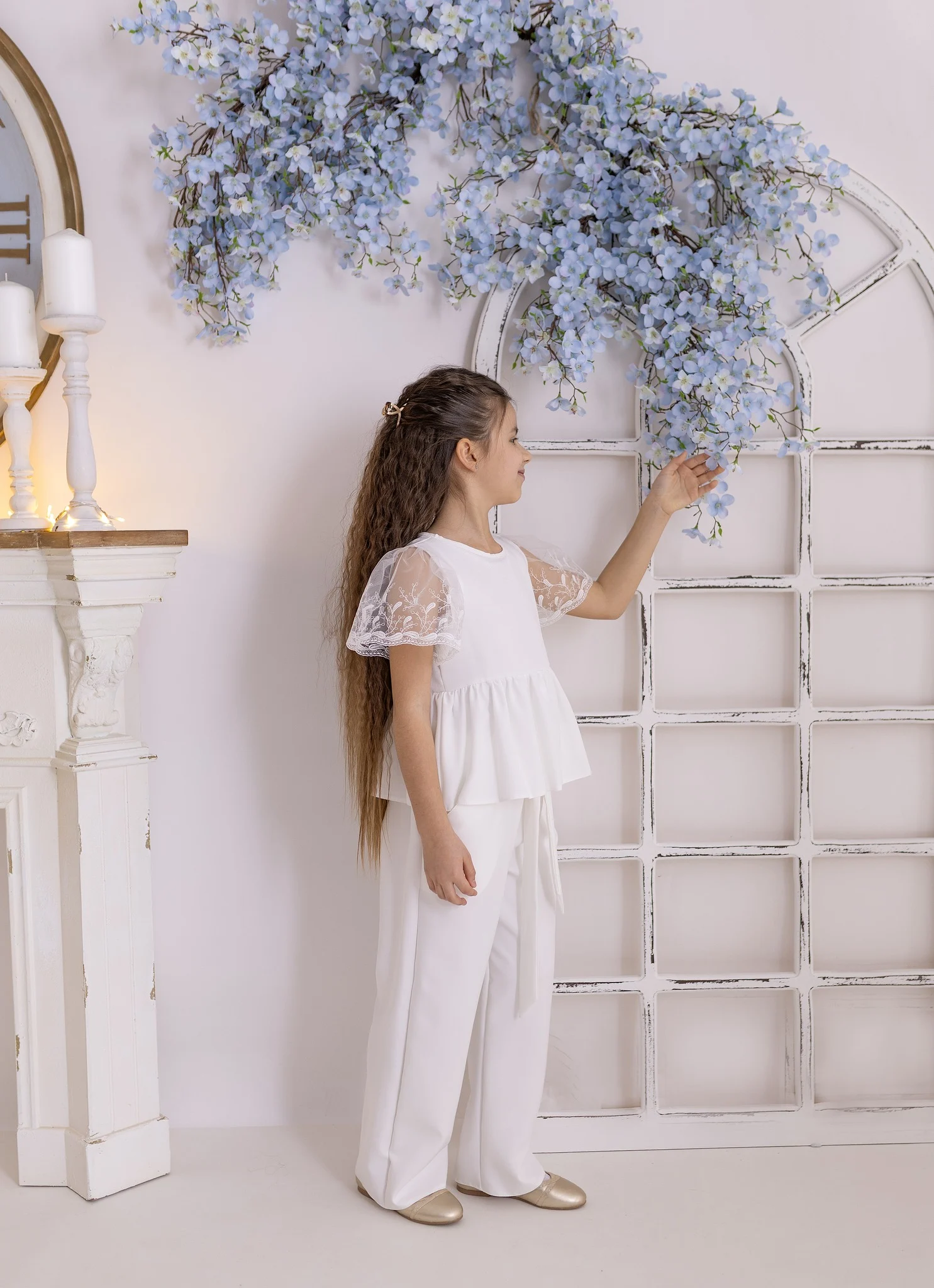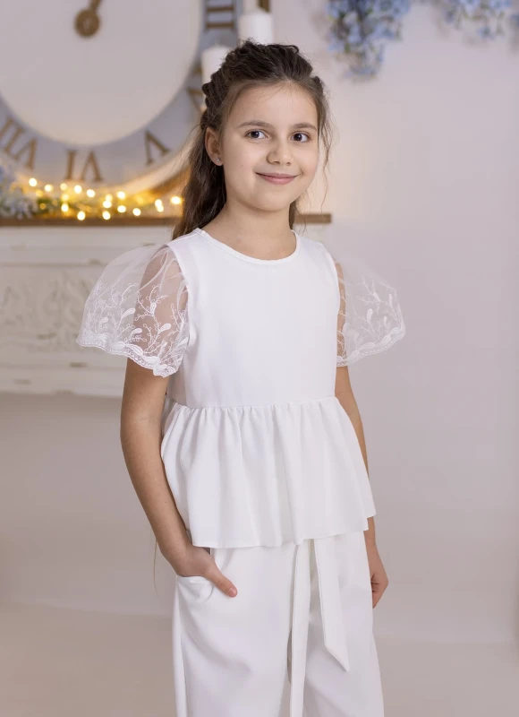 Zapewnij swojej córce wyjątkowy wygląd i pełną swobodę podczas przyjęcia komunijnego. Nasz śmietankowy kompletto doskonała alternatywa dla klasycznej sukienki – łączy w sobie nowoczesny styl z nutką tradycyjnej elegancji.