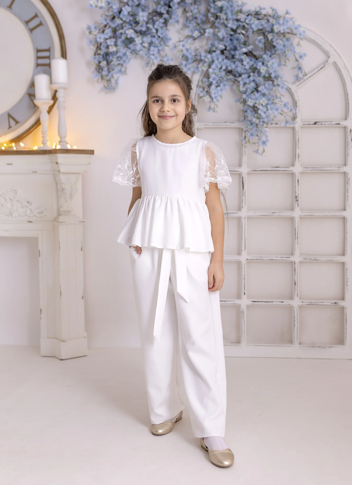 Elementy zestawu: Bluzka z baskinką i krótkim koronkowym rękawem, proste spodnie z paskiem.