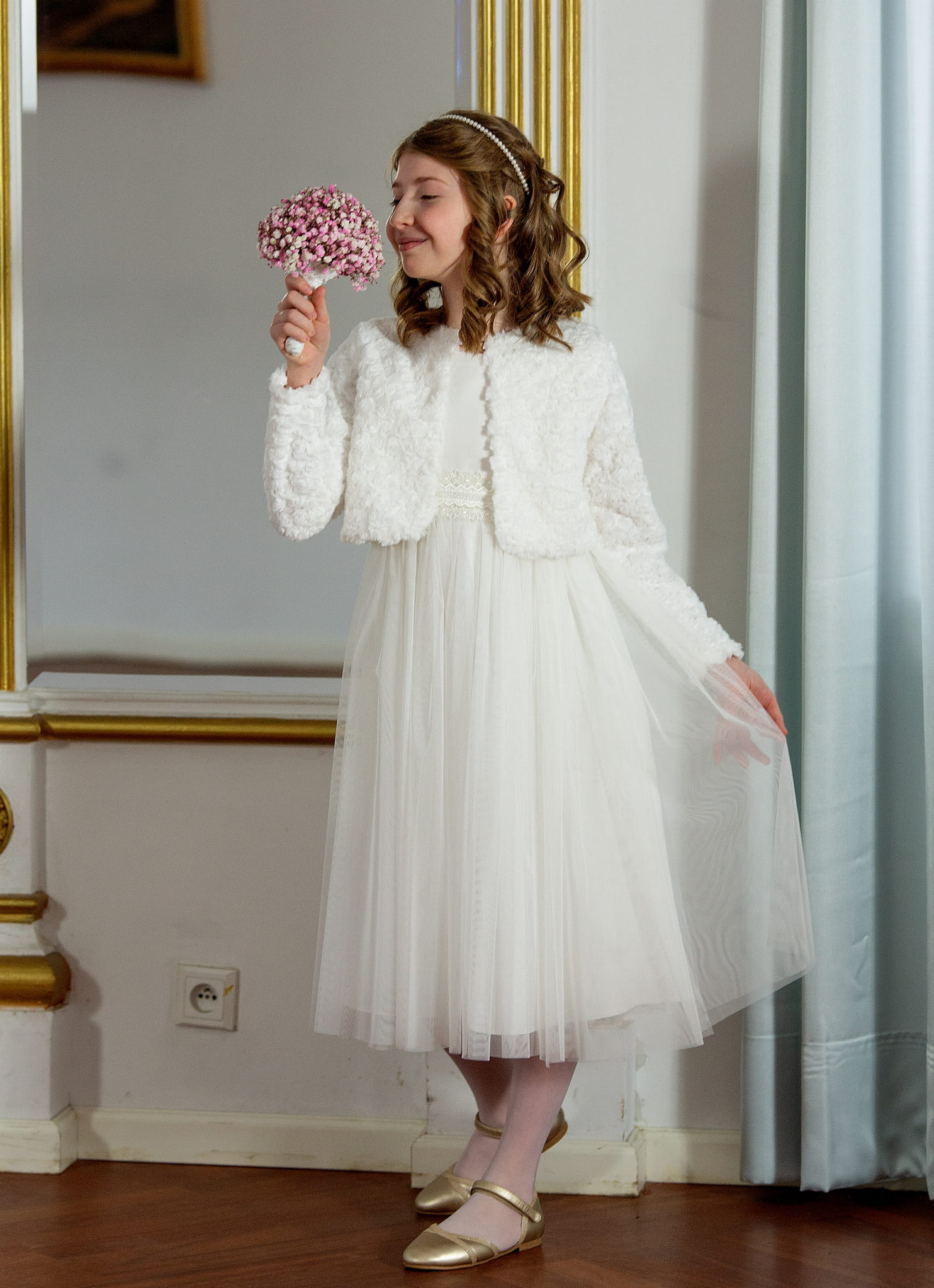 Przedstawiamy przepiękne eleganckie bolerko, które idealnie sprawdzi się jako nakrycie ramion podczas ważnych uroczystości takich jak komunie, chrzty, wesela.