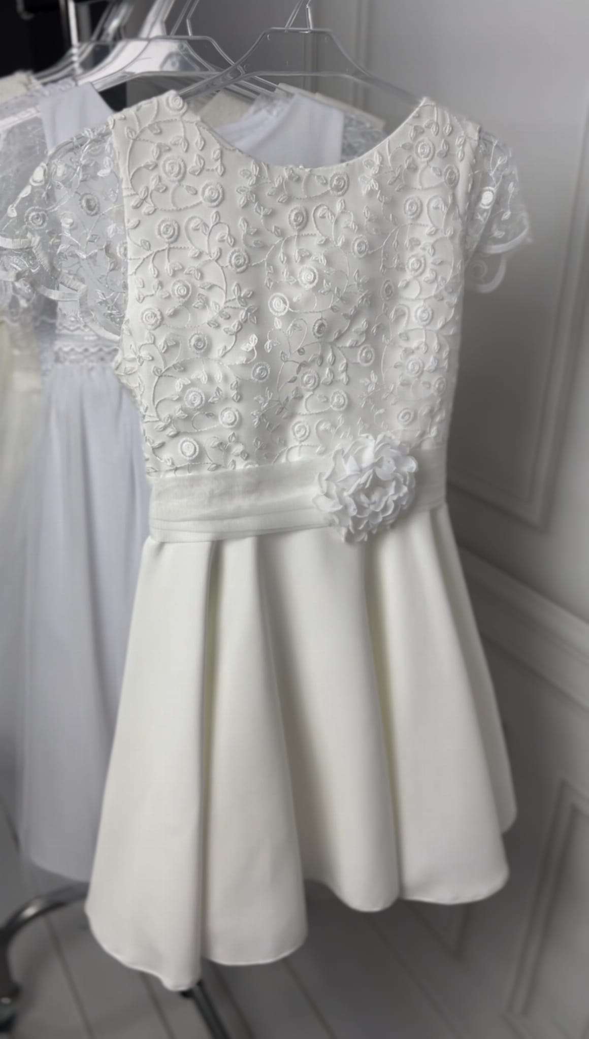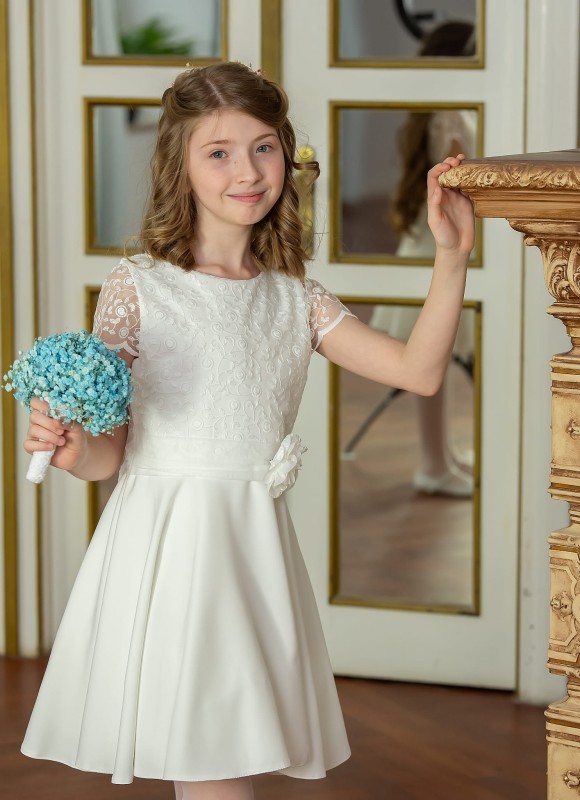 Ecru skromna sukienka na komunię z koronką na kole