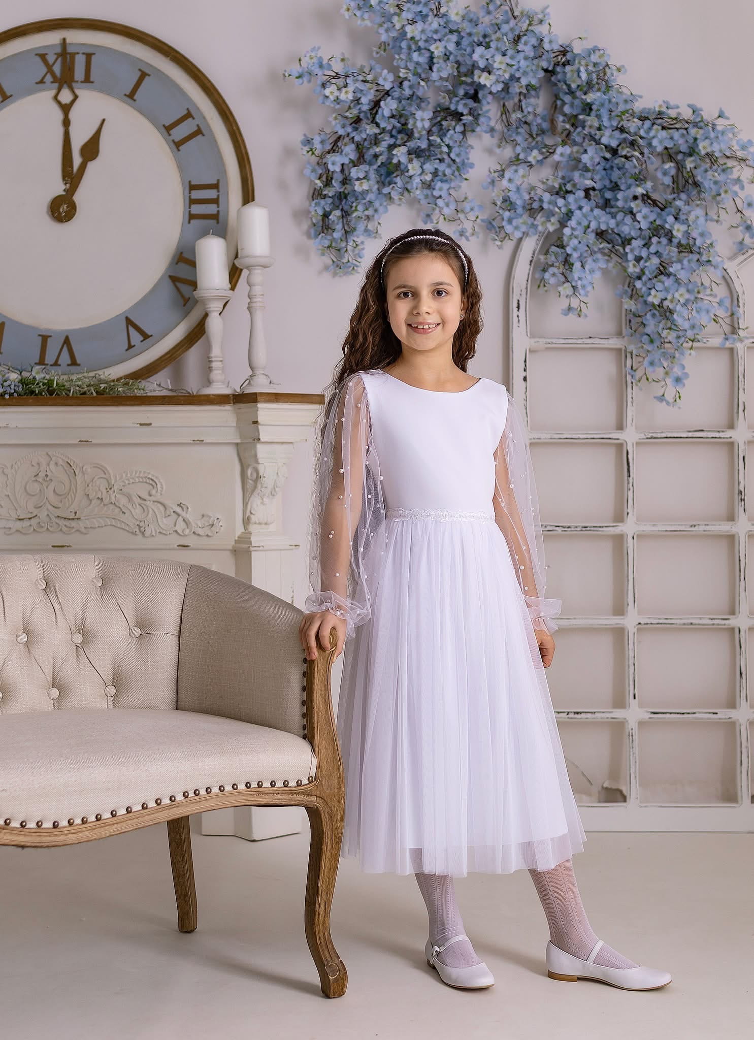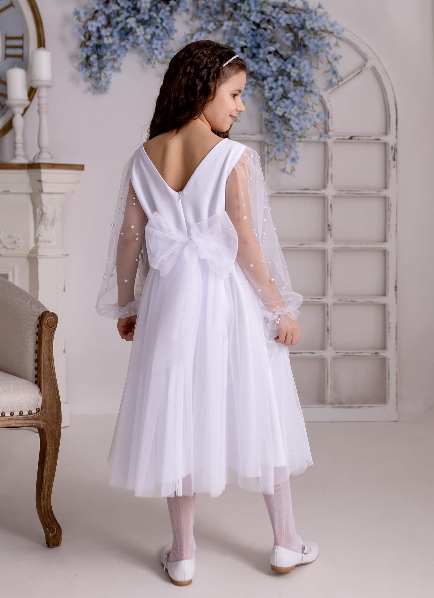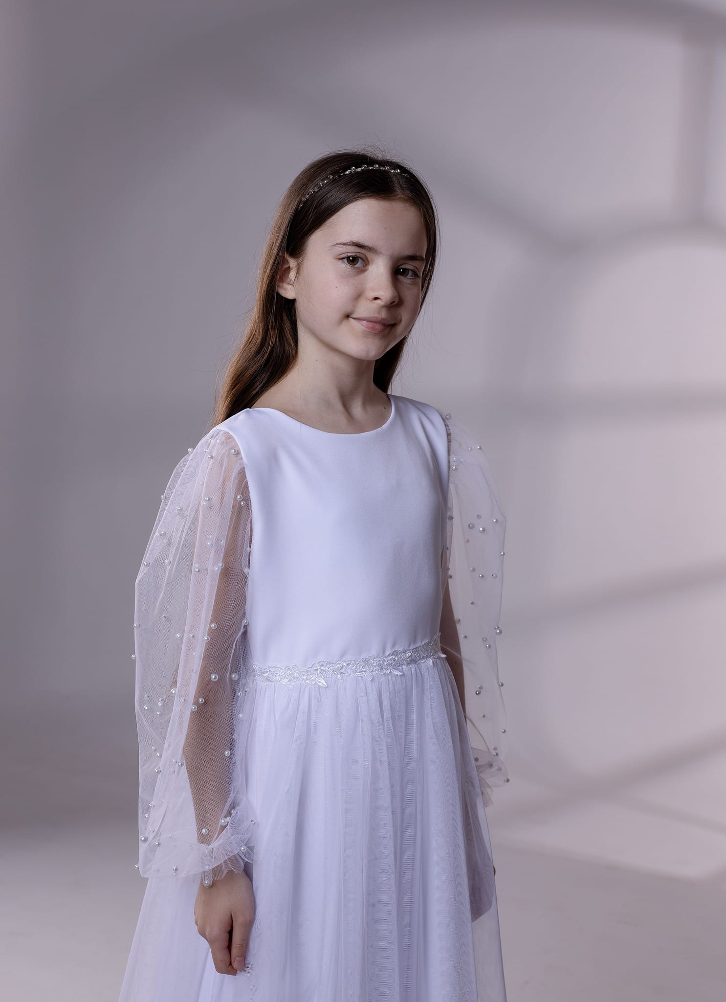 Elegancka Biała Sukienka komunijna z perełkami na rękawach