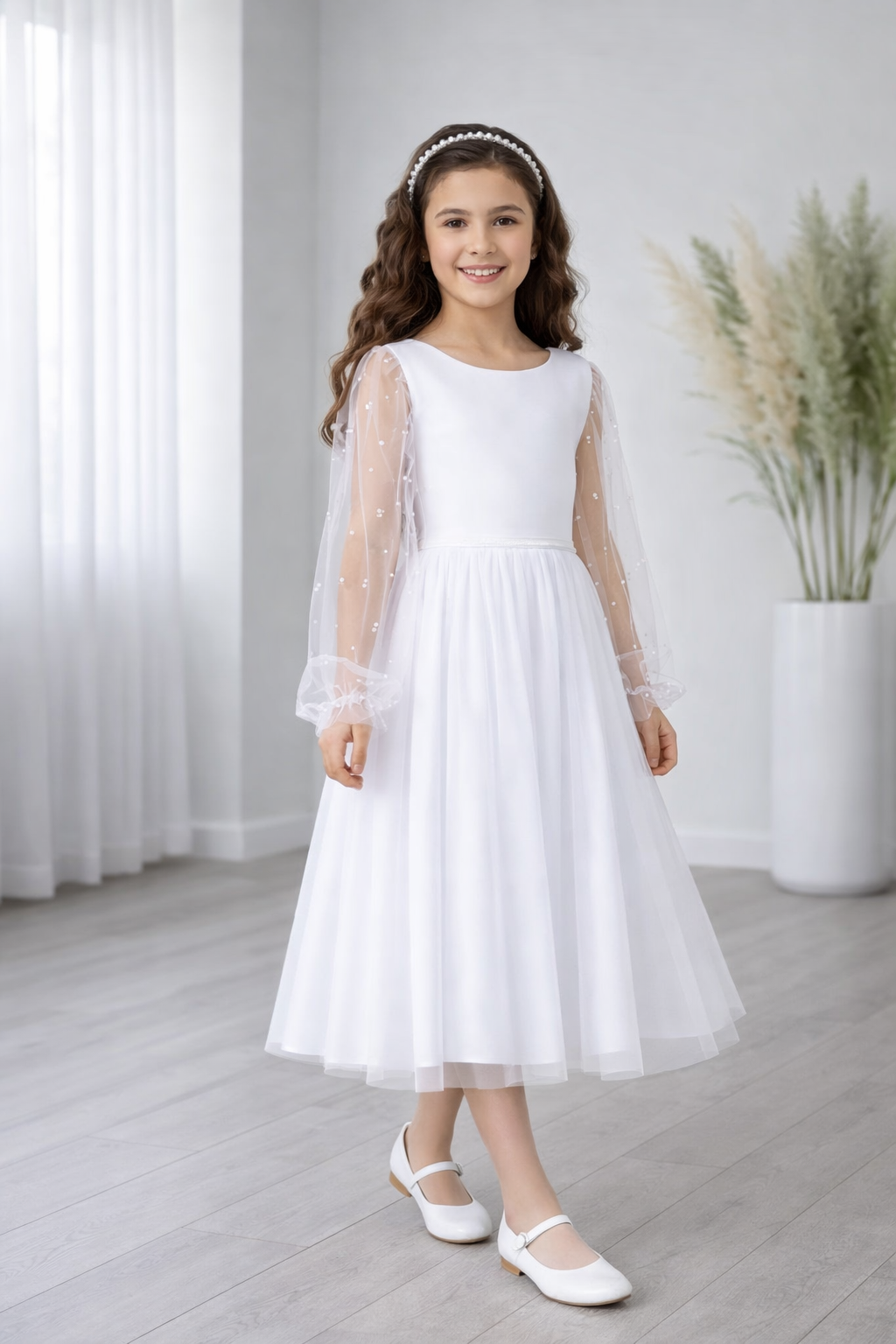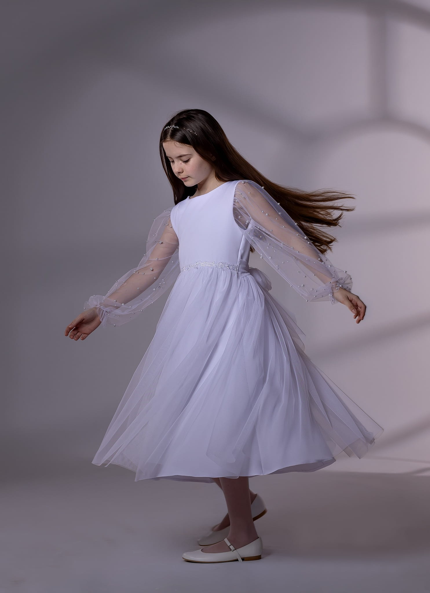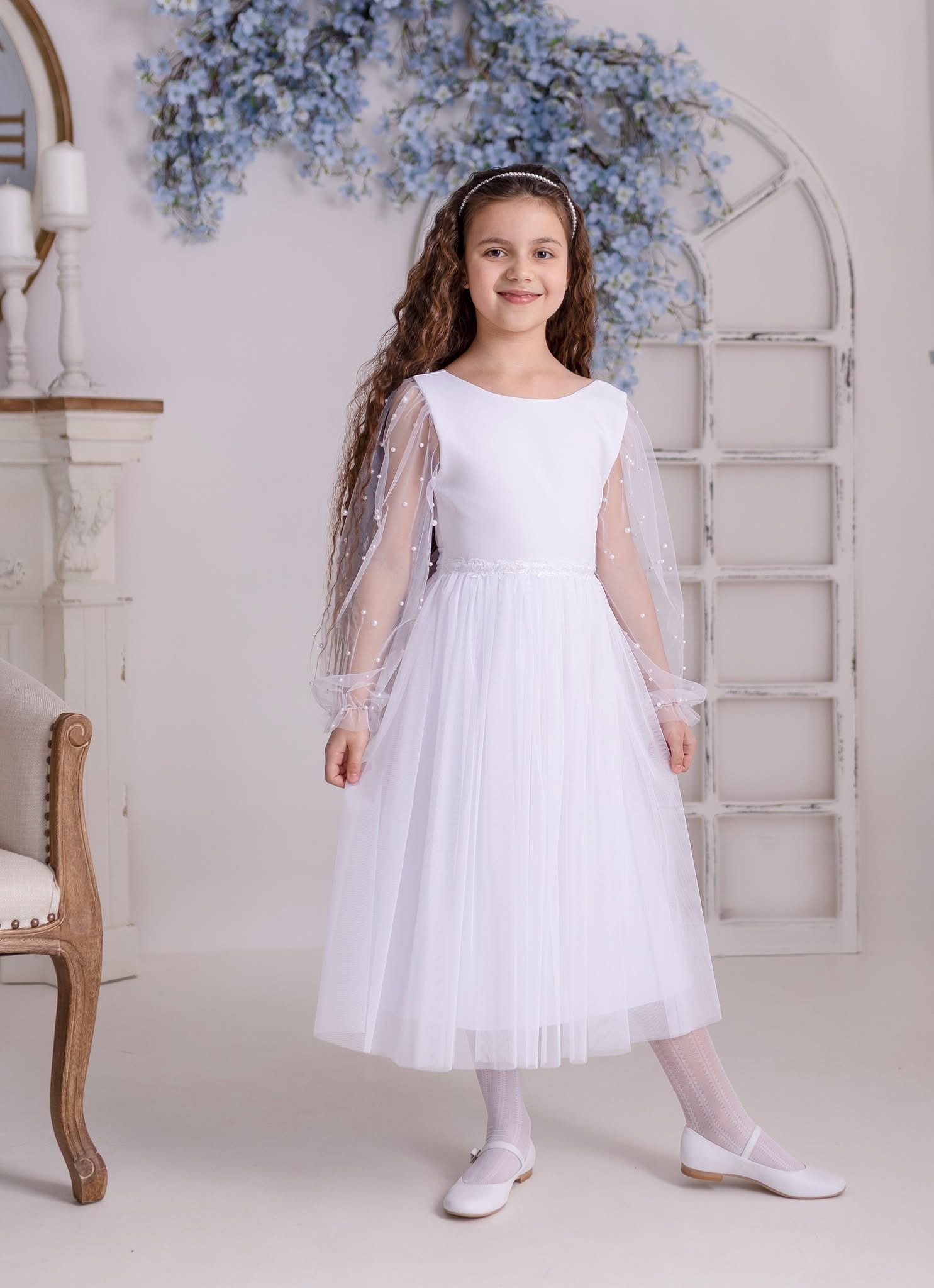 Elegancka Biała Sukienka komunijna z perełkami na rękawach