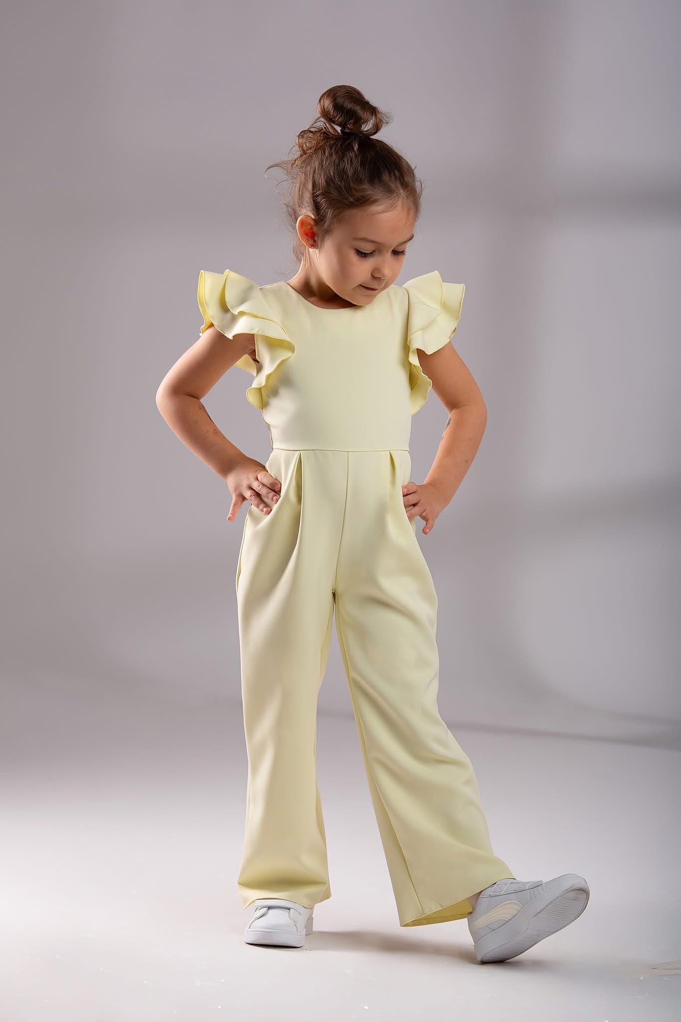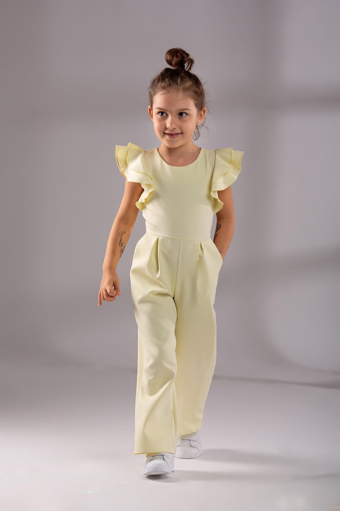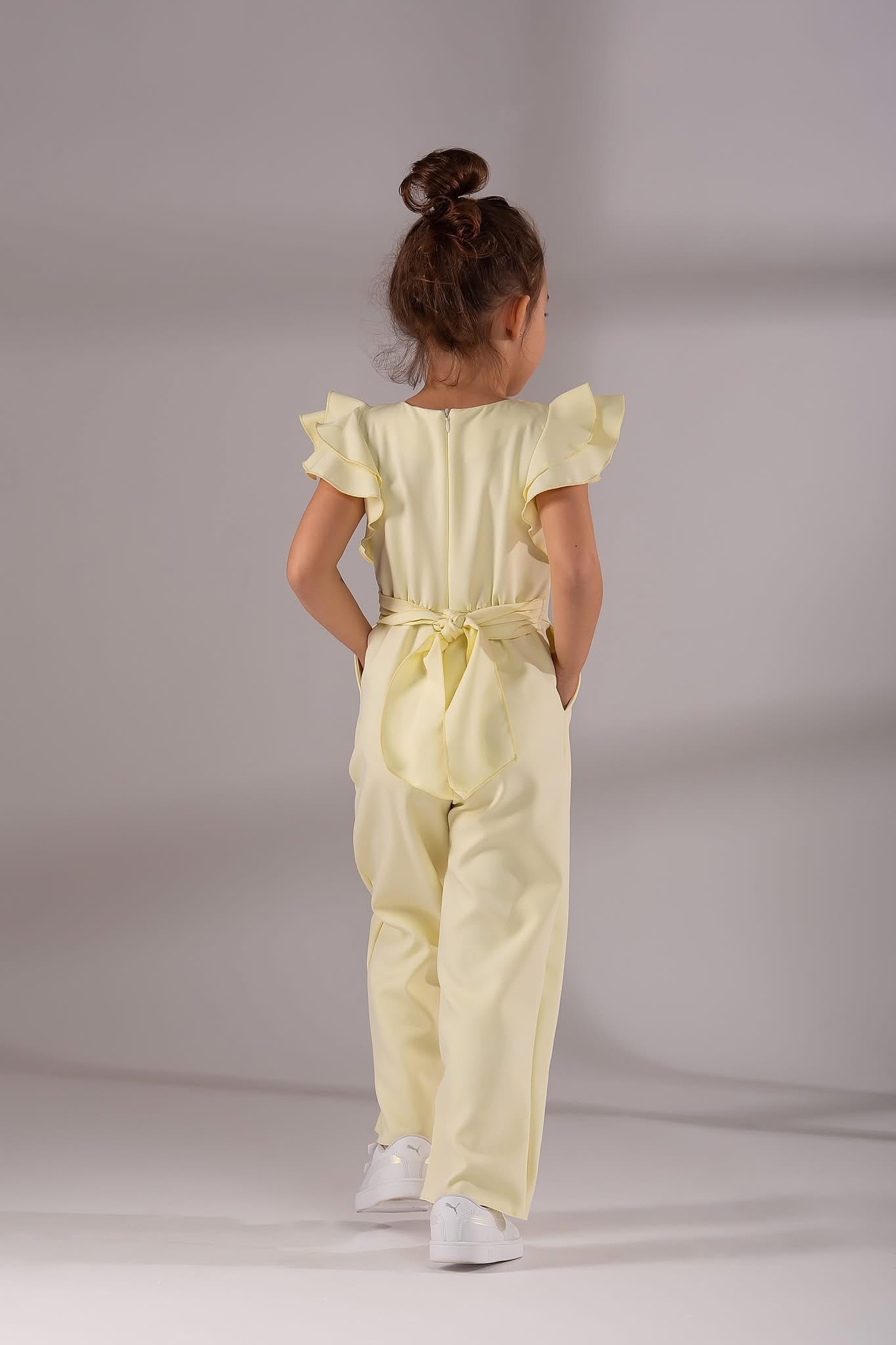 Kombinezon dziewczęcy w kolorze żółtym cytrynowym wiązany z tyłu.