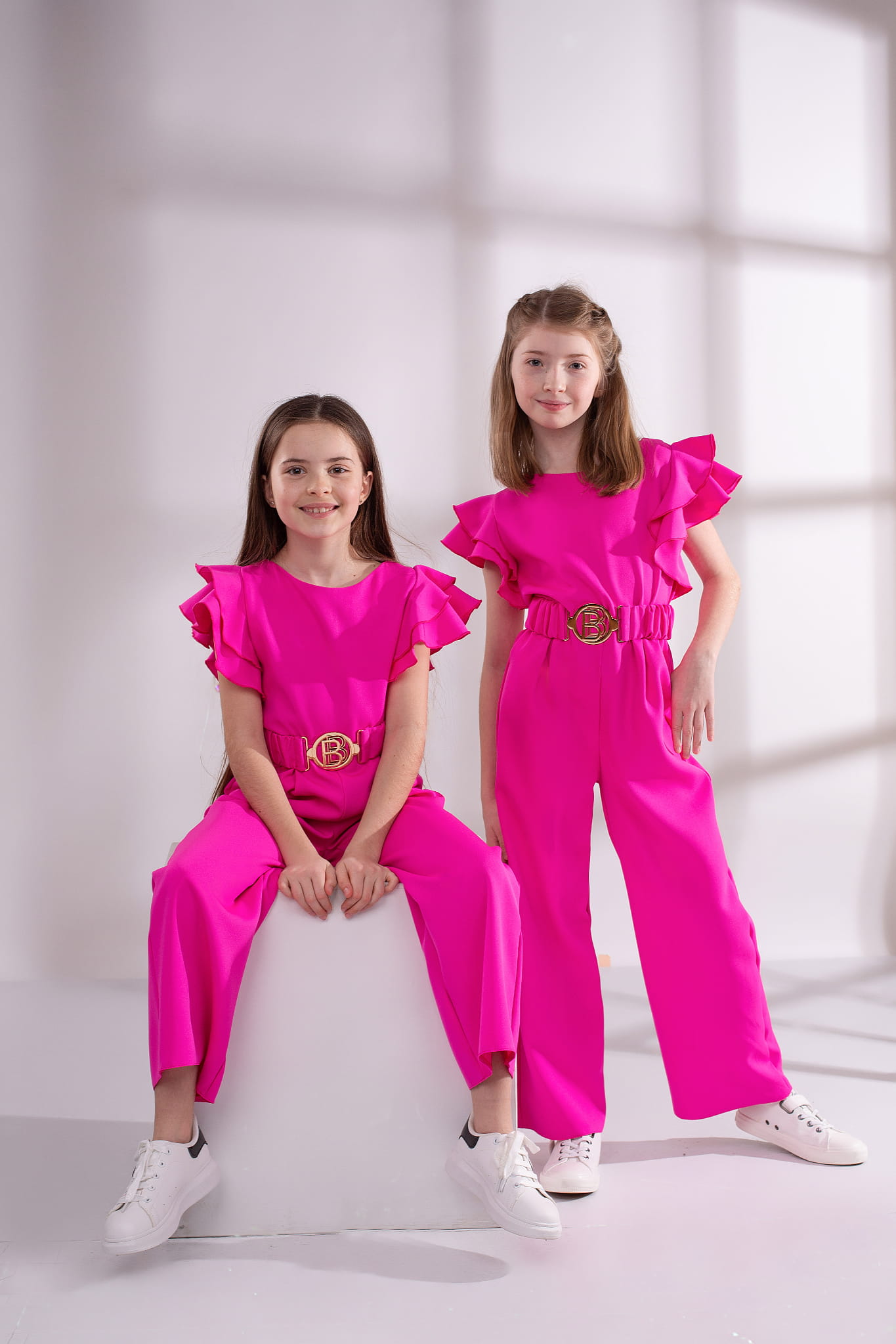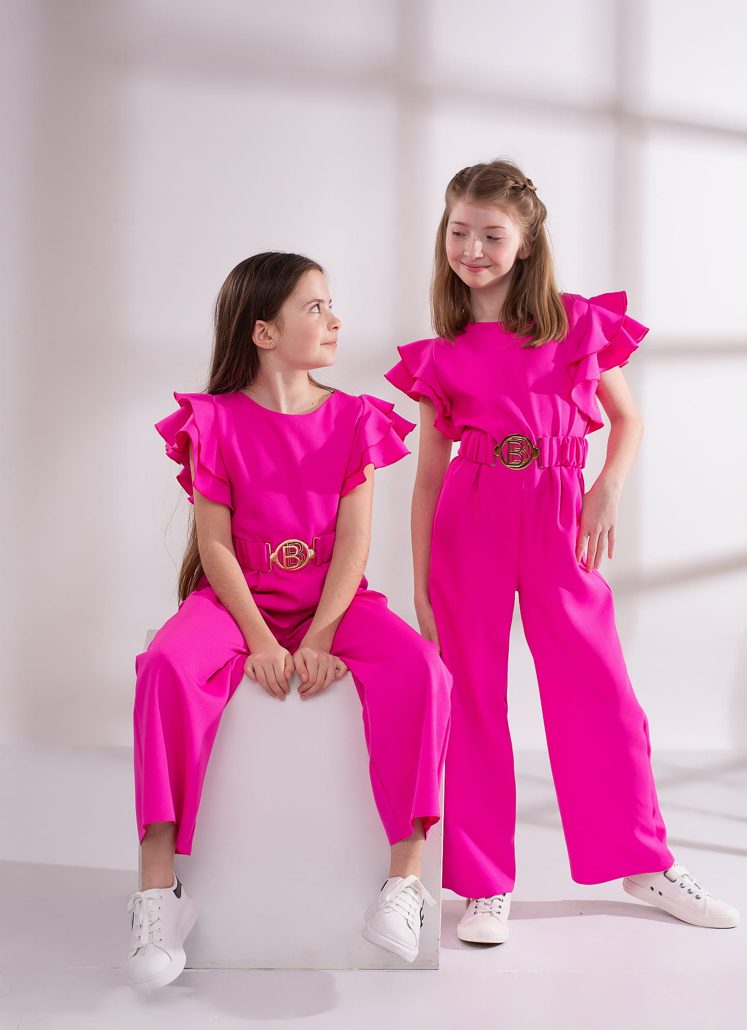 Kombinezony dziewczęce w kolorze fuksja z paskiem.