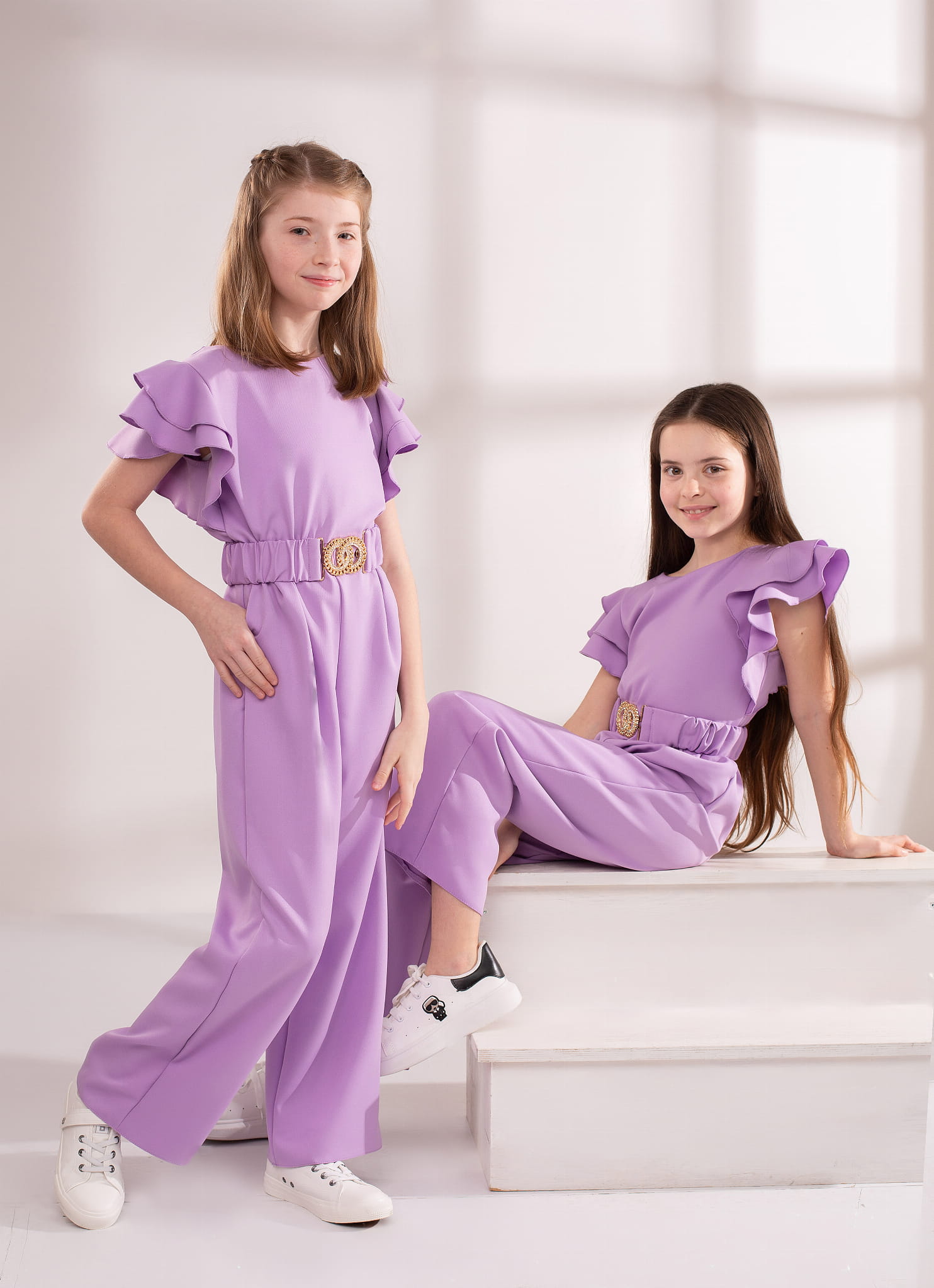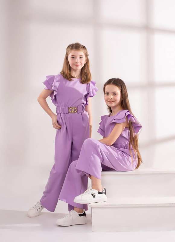 Kombinezony dziewczęce w kolorze lila z paskiem.