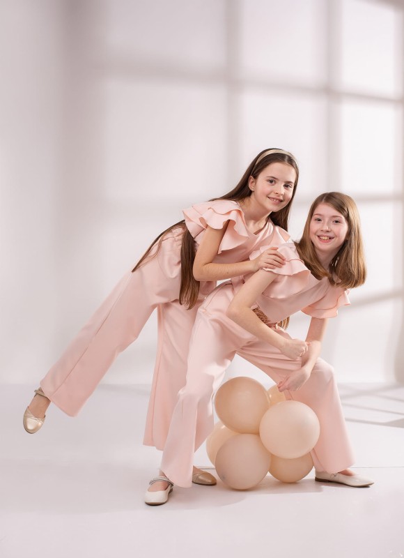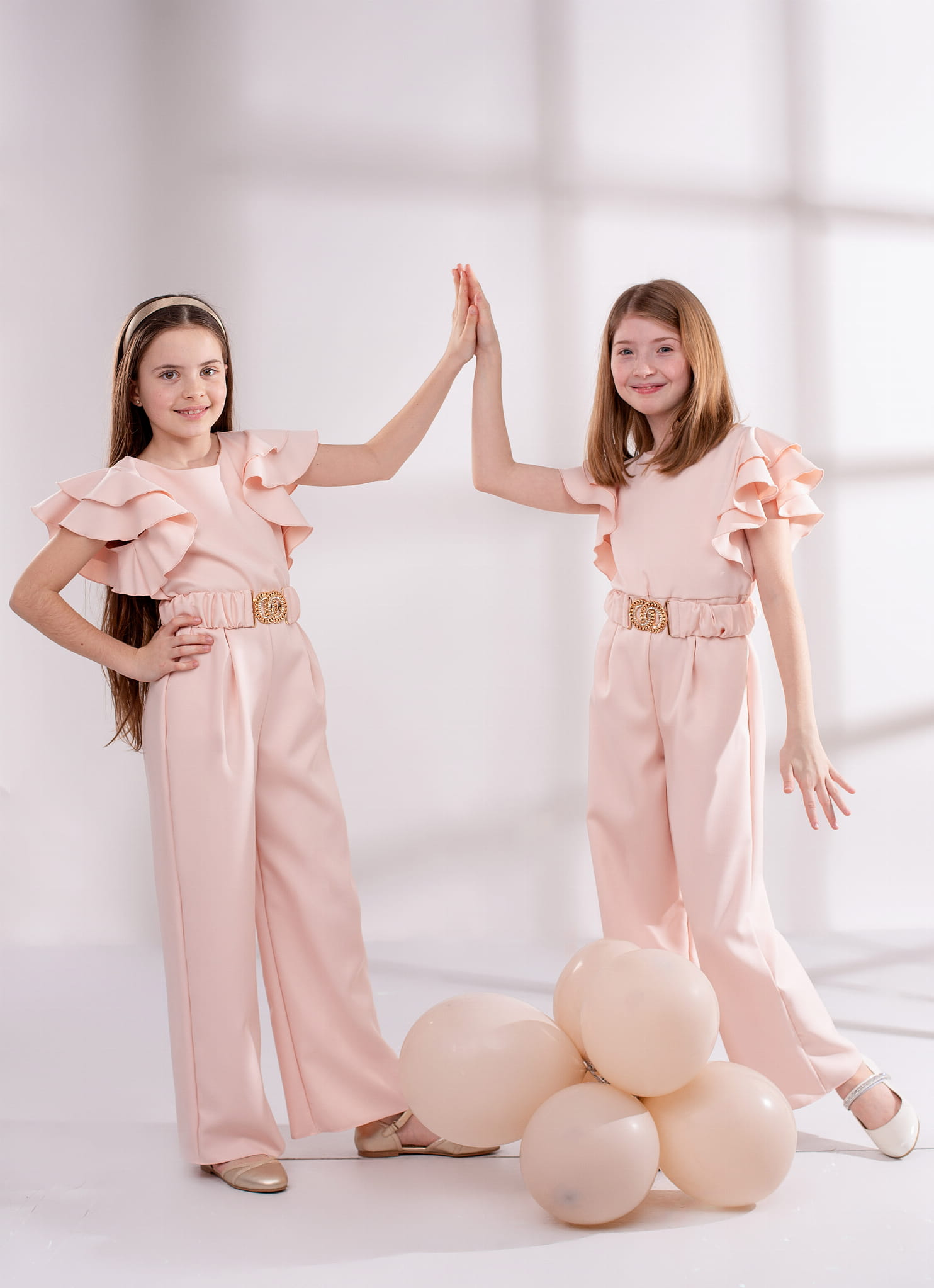 Kombinezony dziewczęce w kolorze łososiowym z paskiem.